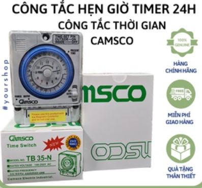 Dưới đây là bộ công tắc thời gian / đồng hồ hẹn giờ cơ dạng 24 giờ cho model phổ biến CÔNG TẮC HẸN GIỜ CƠ TB 35N (còn được bán dưới nhiều biến thể tương tự như Bộ Công tắc hẹn giờ cơ Timer 24H Camsco TB35‑N, Timer 24h Camsco TB35‑N, Công Tắc Hẹn Giờ Cơ Camsco 24H 15A/220V …). Đây là thiết bị hẹn giờ tự động bật/tắt thiết bị điện theo thời gian lập trình, dùng rất phổ biến trong dân dụng và công nghiệp nhẹ.